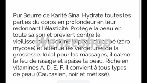Beurre de Karité : recommandé pour tout type de peau, ce beurre de Karité fouetté hydrate toutes les parties de corps en profondeur en lui donnant toute l’élasticité et protège la peau en toute saison. Prévient contre le vieillissement, il soigne la peau du bébé (zéro mycoses) et atténue les vergetures de la grossesse et prend soin des cheveux.
